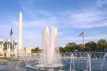 Washington D.C., USA, October 2016; Water splashing from the fountain at the World War II memorial with the Washington Monument in the background in the National Mall in Washington D.C.