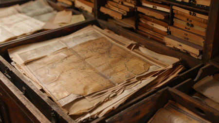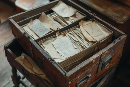 Old wooden chest overflowing with aged documents, papers, and files, hinting at a history of forgotten stories