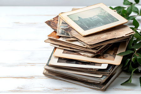 A nostalgic stack of vintage photographs displayed on a wooden surface, accented by gentle greenery. Perfect for evoking memories and timeless stories.