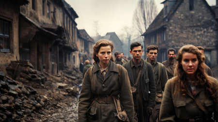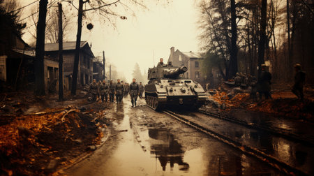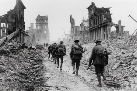 British soldiers walking down a muddy road amidst destroyed buildings in a European city during world war one