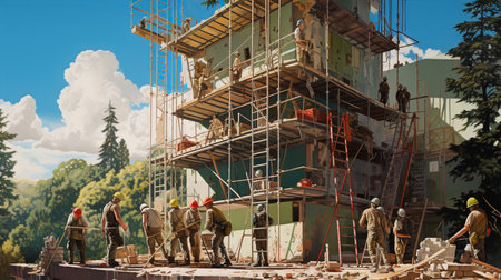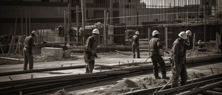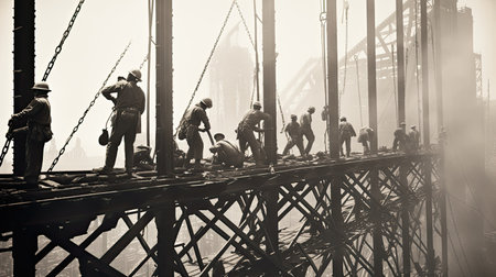 Construction Workers Building Framework Represent the Diligence and Teamwork , Construction workers collaborating on a steel framework, Ai generated