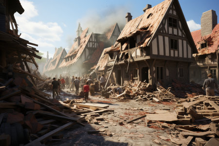 Explore a post-apocalyptic medieval town with abandoned buildings and rubble. Nature reclaims the land with overgrown weeds and moss, creating a haunting atmosphere.