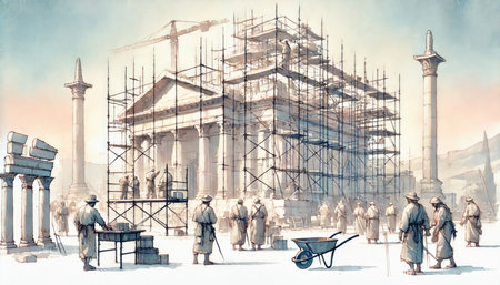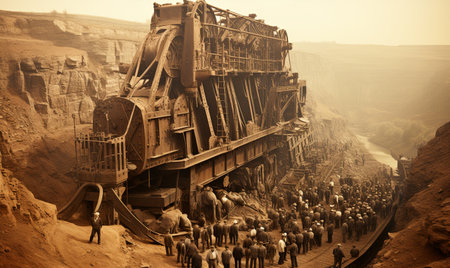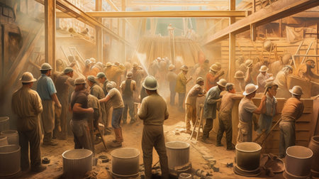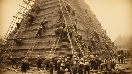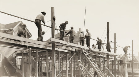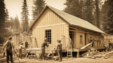 A vintage photograph depicts construction workers assembling a large stone structure in a rural area, highlighting teamwork and labor during a historic era.