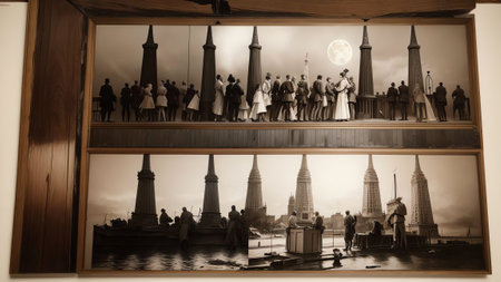 A person examines an old portrait in a collection of vintage photographs, surrounded by aged images and memorabilia, evoking nostalgia and curiosity about the past.