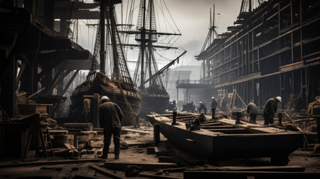 Colonial-Era Shipyard in Black and White meticulous construction of a wooden sailing vessel