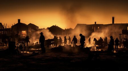 19th Century Western Frontier Town: Cowboys gather at dusk