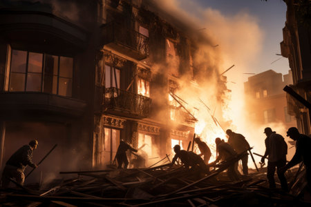 Firefighters and firemen at the scene of a major fire in Kiev, Ukraine, Rear view of a group of mine workers wearing helmets, AI Generated
