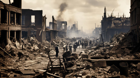 An AI generated illustration of Soldier looking at devastated city after war. AI Generative illustration