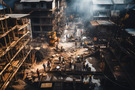 Bird's Eye View of a Bustling Construction Site in the Heart of the, Bird's eye view of a bustling construction site, Bird's Eye View of a Bustling Construction Site with Towering Cranes, Ai generated