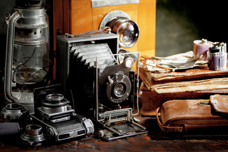 Vintage black and white photos and old obsolete camera history concept
