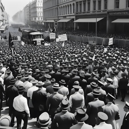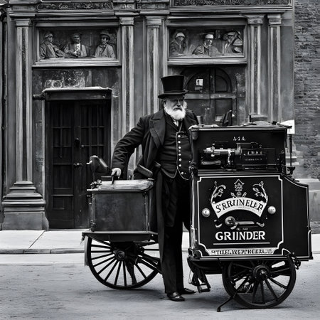 A classic car from the early 1900s glides down a bustling city street. The driver, dressed in formal attire and a top hat, exudes a sense of pride and nostalgia as he navigates through the urban landscape.