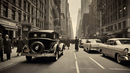 old vintage Town of New York with a lot of traffic and skyscrapers