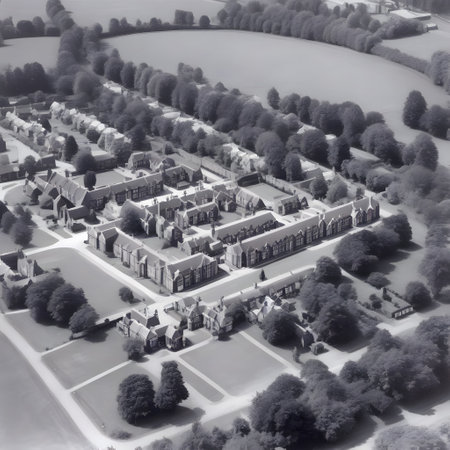 A pair of hands holds an old, sepia-toned aerial photograph, showing a meandering river, a small village, and patchwork fields from above. The image evokes a sense of history, memory, and archival research.