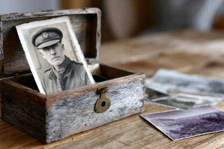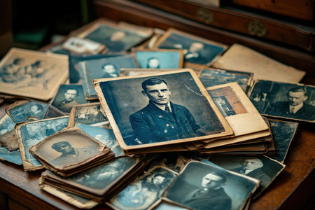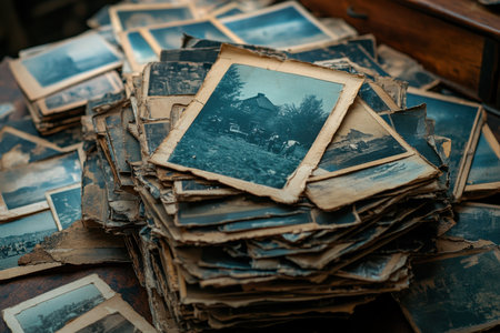 Old, vintage photographs rest on an antique table, creating a warm, nostalgic atmosphere perfect for antique shops or vintage studios.