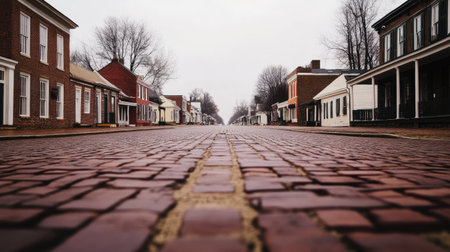 A peaceful image of an empty brick road in an old town, lined with historic buildings, creating a tranquil atmosphere perfect for exploration.