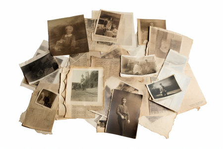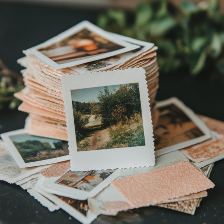 A collection of old photographs, some worn and faded, lies on a rustic table, evoking memories and a sense of nostalgia perfect for vintage themes.