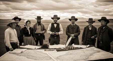 Group of men dressed in traditional clothes standing in a field and looking at map