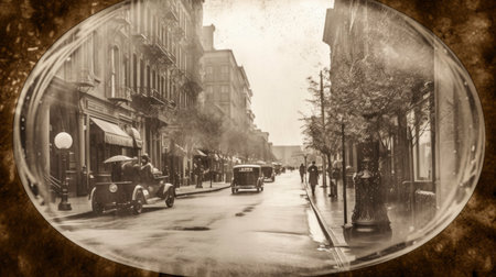 A captivating window display featuring vintage photographs hanging above a cobblestone street. The serene scene showcases urban charm and a nostalgic atmosphere.