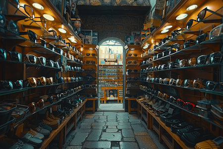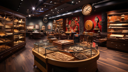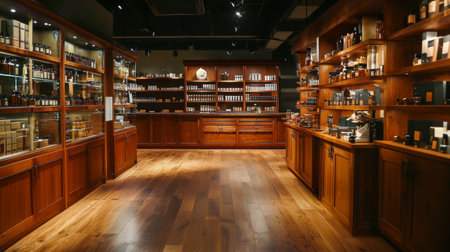 A luxurious wood-paneled shop interior featuring shelves filled with various packaged products and soft, ambient lighting. Ideal for themes of retail, elegance, and quality.