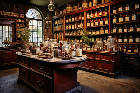 The image shows a room brimming with numerous jars filled with different types of liquid, Interior of a 19th century apothecary shop, AI Generated