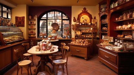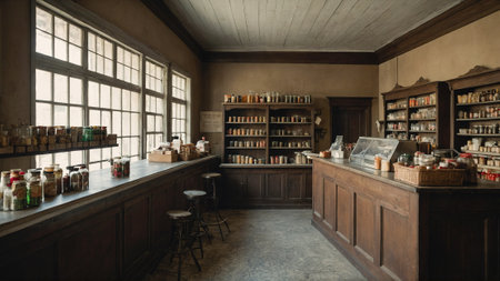 Interior of small grocery shop of 1920s with counter and goods, AI generated image