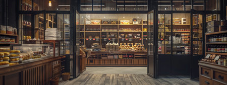 The cozy interior of a gourmet grocery store, showcasing a variety of high-end food products. The warm lighting and wooden accents create an inviting atmosphere, perfect for themes of luxury shopping and artisanal foods.