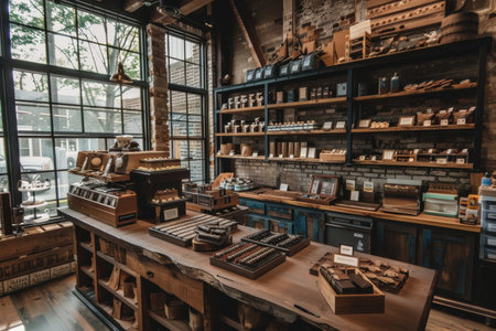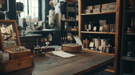 A cozy vintage store featuring wooden shelves filled with artisanal goods, glass jars, and classic packaging, lit by warm ambient lighting.