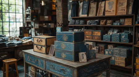 Vintage market stall filled with an assortment of products, including packaging, books, and crafts, evoking a nostalgic and charming atmosphere.