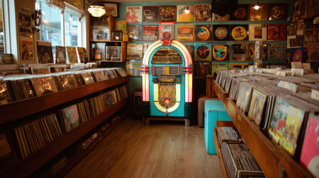 Vintage record store interior with colorful vinyl covers displayed on wooden shelves and a jukebox in the corner