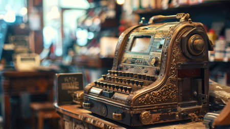 A nostalgic view of a traditional bank interior, featuring an antique cash register, a wall-mounted rotary telephone, and a classic interest rates sign. The scene evokes a bygone era of financial transactions and historical banking practices, illuminated by warm, atmospheric lighting.