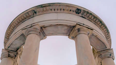 Clear Panorama Looking up at a white circular structure supported by smooth columns. A vast white sky can be seen behind the structure on this sunny day.