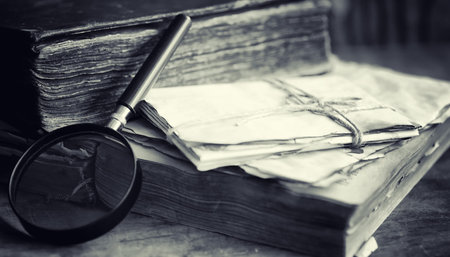 A vintage-style desk with old handwritten documents, lit by the warm glow of an antique lamp.