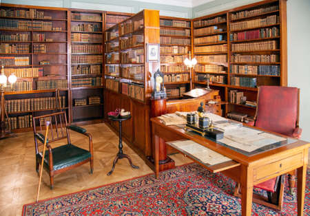 Litomysl, Czech Republic, 17 April 2022: castle chateau baroque representative interior with baroque classic furniture, vintage framed photographs on the table, porcelain figurines