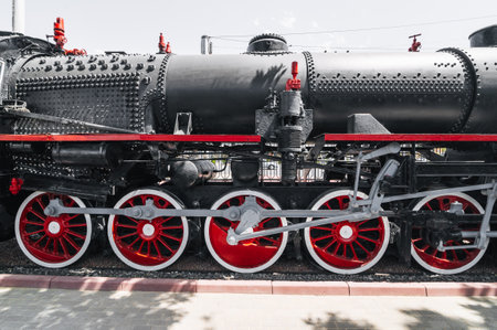 Closeup antique vintage train locomotive. Old steam engine locomotive. Black locomotive. Old transportation vehicle.