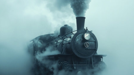 A classic steam train, shrouded in mist, creating a dramatic and nostalgic visual.