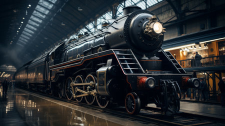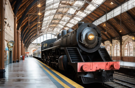 Old-fashioned train station with a steam locomotive waiting on the platform
