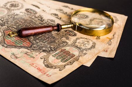 Belarus, Soligorsk, July 1, 2019: mastery of restoring old vintage damaged photos of close-up specialist working place with a pair of tweezers with a magnifying glass and gloves
