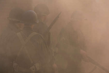 War Concept. Military silhouettes fighting scene on war fog sky background, World War Soldiers Silhouettes Below Cloudy Skyline At night. Attack scene. Armored vehicles. Selective focus. Decoration
