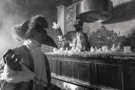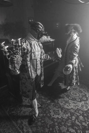 Actors in steam punk masks and antique costumes indoor. Black-white photo.