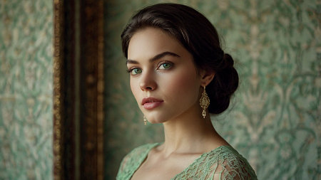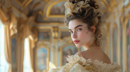 Elegant Woman in a Luxurious Setting, Baroque Inspired Hairstyle and Makeup
