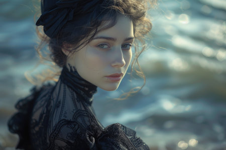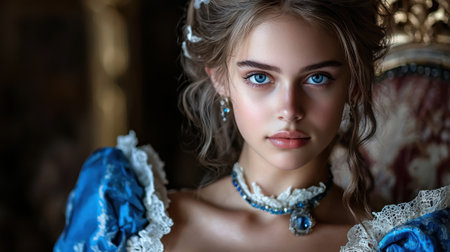 Soft light highlights a young woman dressed in period attire, with delicate fabrics framing her gentle features. She exudes a serene and timeless beauty.