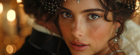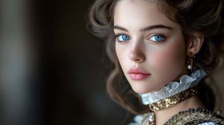 Elegant woman with period attire, adorned with pearl earring and ornate necklace. Her striking gaze contrasts with soft lighting, highlighting delicate features. Background features a blurred portrait
