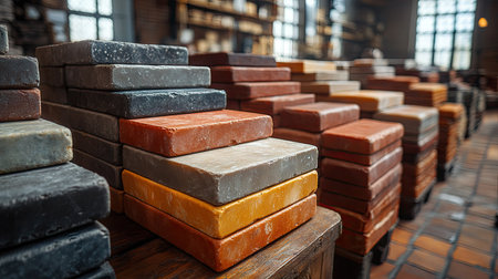 This image showcases an assortment of rectangular stones stacked neatly. The stones exhibit a range of colors, from gray and brown to orange and red. The composition, lit by natural light, highlights textures. Suitable for illustrating construction, design, and similar commercial applications.