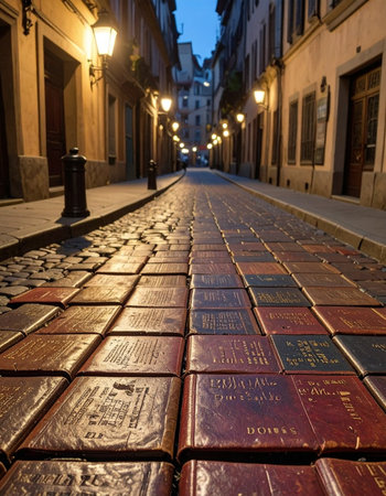 At twilight, a hidden alley in an ancient city reveals its secret: a path paved not with stones, but with the spines of countless old books.