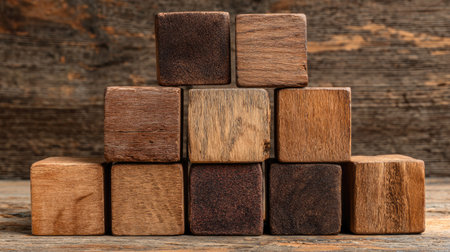A captivating arrangement of wooden cubes on a rustic surface, showcasing the natural beauty and textures of wood, perfect for crafts or design inspiration.