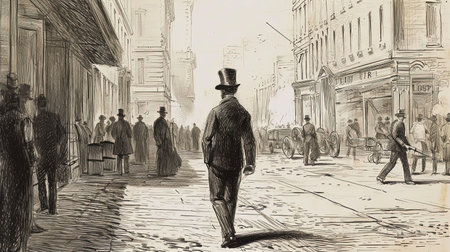 Inspirational drawing depicting a man walking the streets of New York in the year 1850