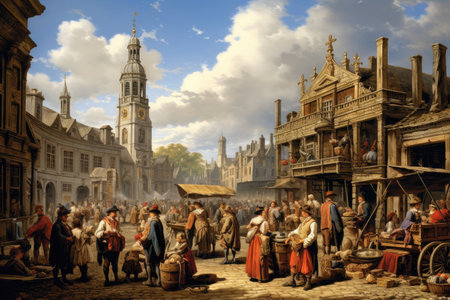 Digital composite of Medieval scene with people in front of Bruges, A bustling marketplace in a Moroccan city, AI Generated