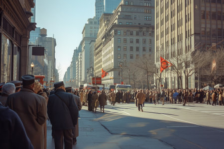 A busy street lined with towering buildings is filled with a crowd of people walking, The scene of a victory parade in the heart of a city, AI Generated