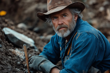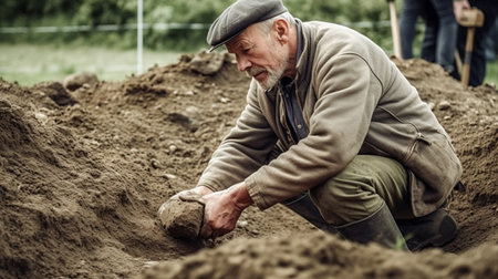 An elderly Caucasian male archaeologist is digging for artifacts at a work site.