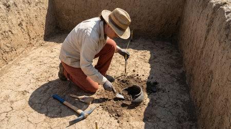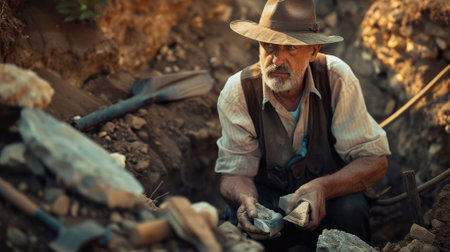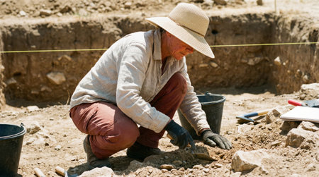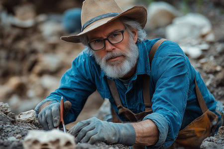 A dedicated archaeologist wearing a hat and gloves meticulously uncovers historical artifacts or fossils from the earth at an active outdoor excavation.